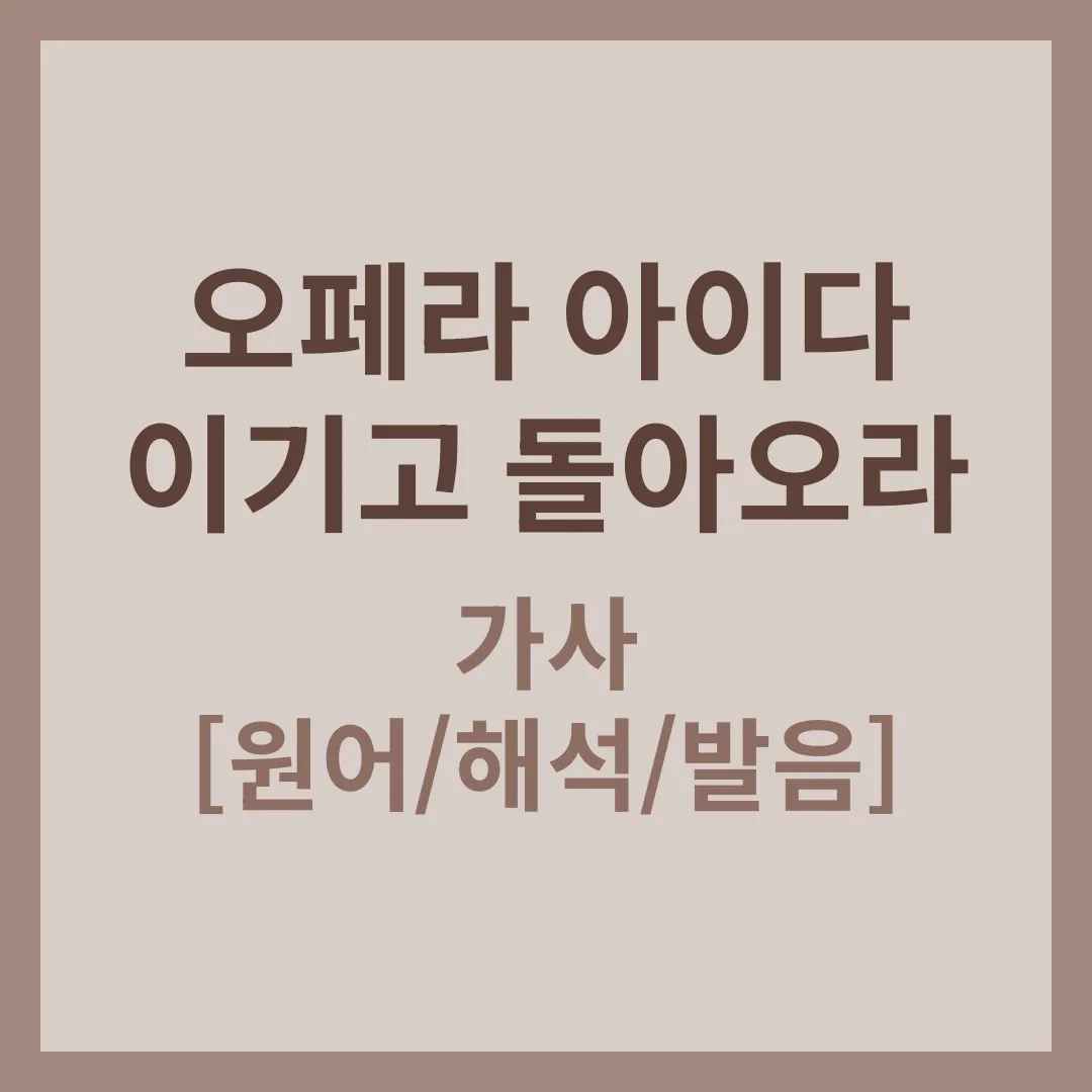 '이기고 돌아오라'는 1막에서 라다메스가 에티오피아 원정의 총사령관으로 임명된 후, 백성들의 환호를 받으며 떠나는 장면에서 아이다가 부르는 노래입니다. 겉으로는 연인을 응원하지만, 속으로는 찢어지는 고통을 느끼는 아이다의 이중적인 감정을 가사 한 소절 한 소절에 담아냈습니다. 아래에서 가사, 발음, 해석을 한눈에 살펴보세요.