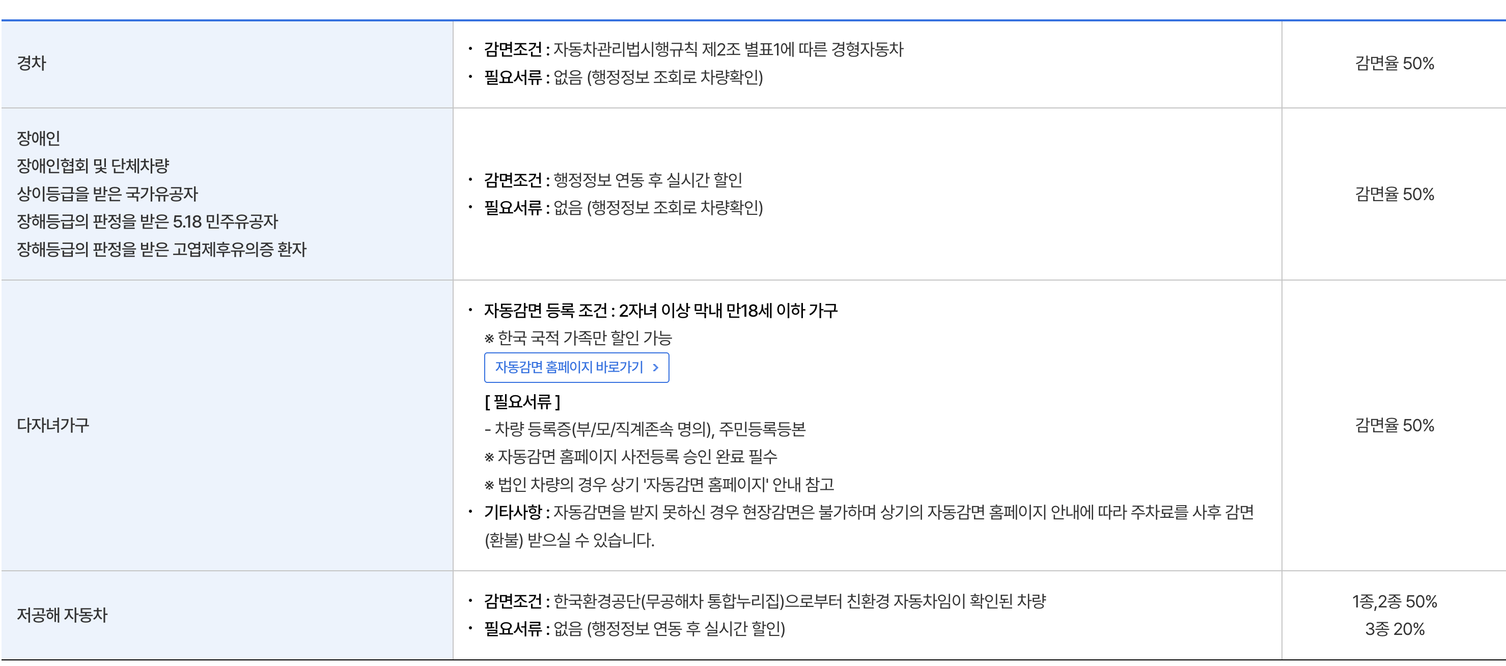 - 경차 (1,000cc 미만): 50% 할인
