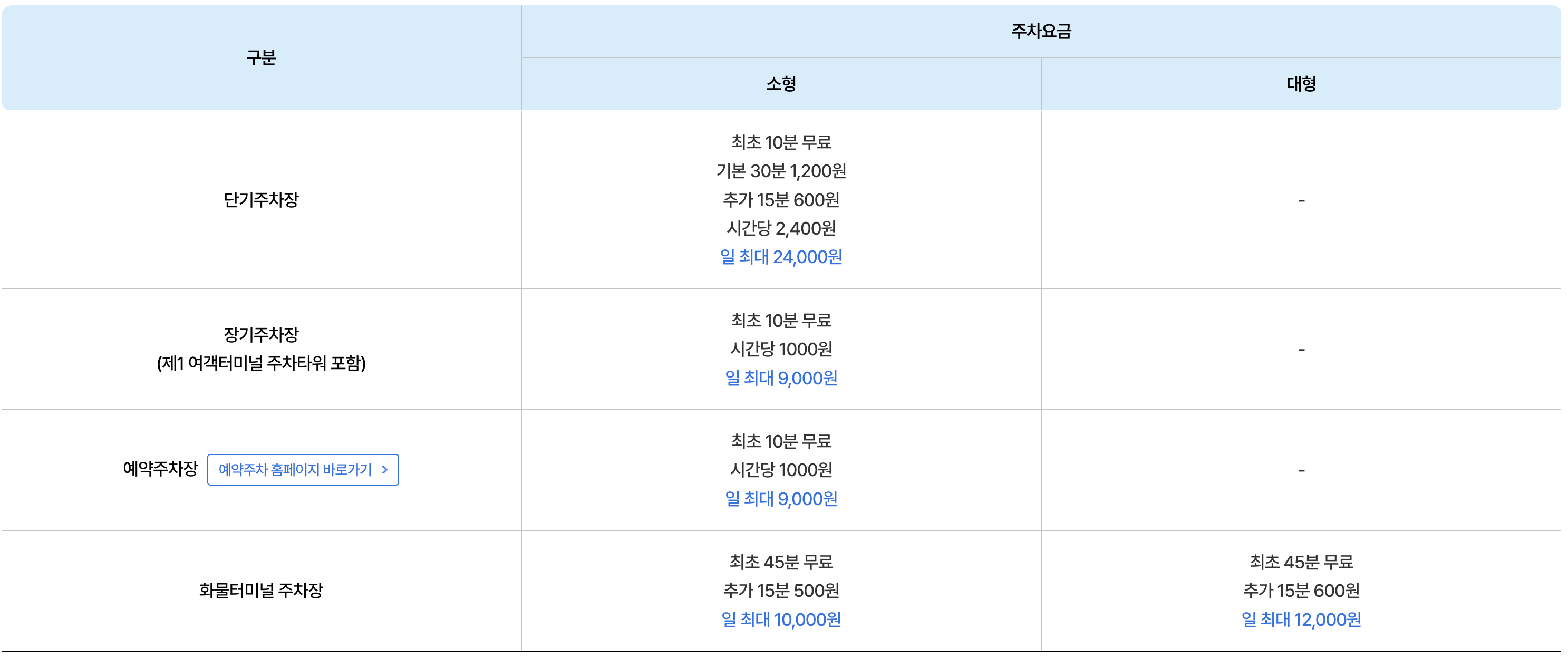 * 화물터미널 주차장은 1일 10,000원입니다. (T1의 P5 주차타워 일부 포함)