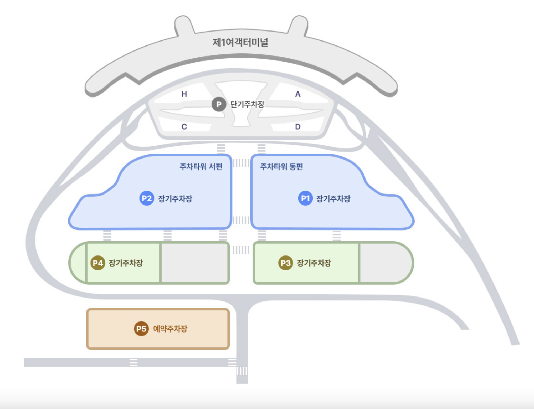 각 터미널은 여행 기간에 따라 '단기 주차장'과 '장기 주차장'으로 나뉩니다.